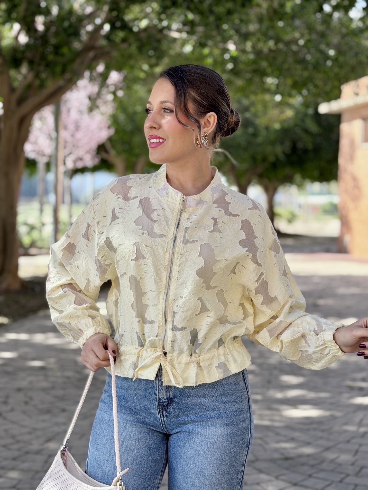 Chaqueta ligera de diseño sofisticado con tejido semitransparente y delicado relieve floral que aporta textura y distinción. Su corte recto se adapta con naturalidad a la silueta, mientras que el cierre frontal con cremallera metálica añade un contraste moderno y funcional.