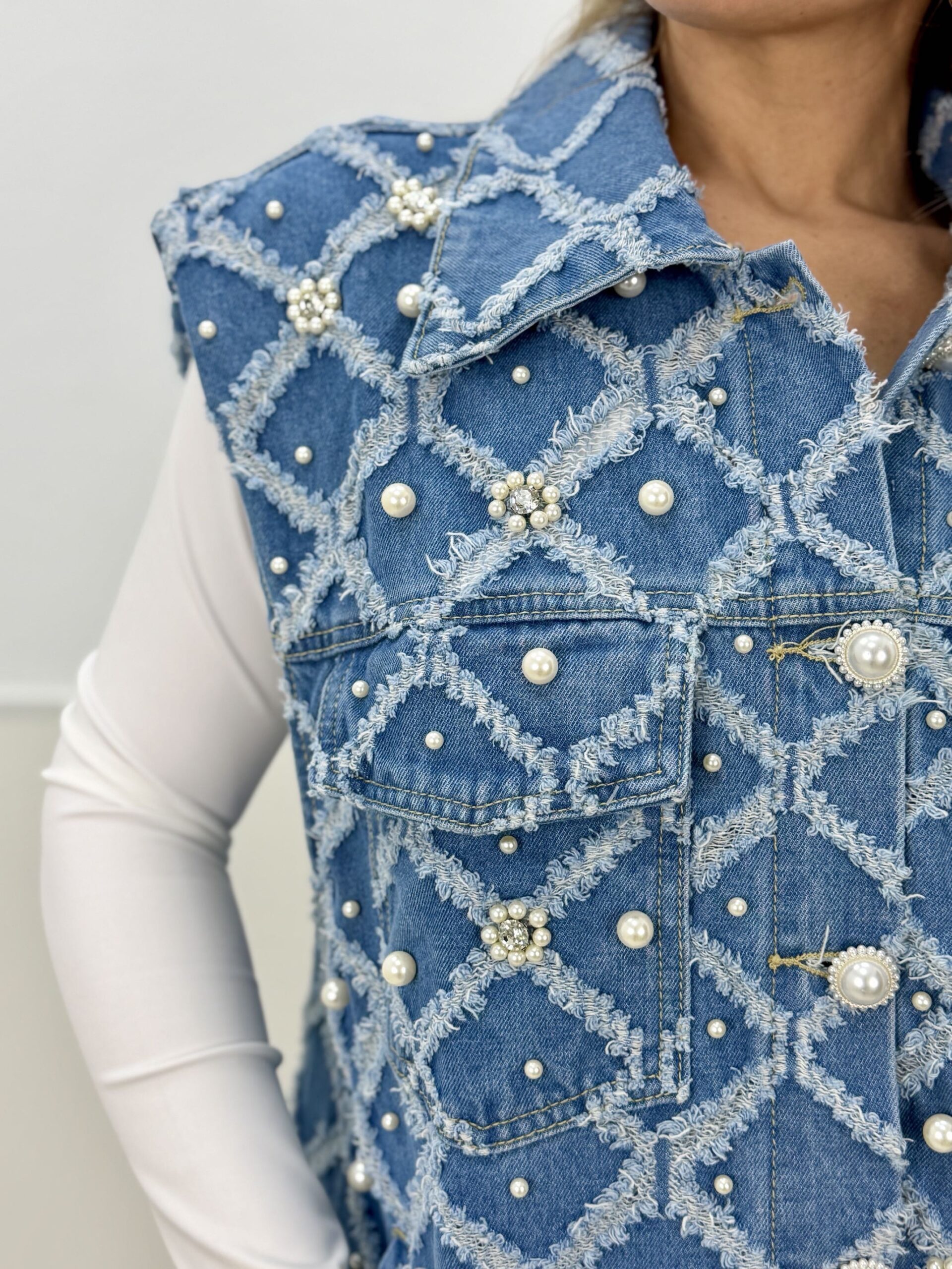 Chaleco denim con diseño estructurado y detalle de aplicaciones de perlas decorativas. Cuenta con cuello clásico, cierre frontal con botones y bolsillos delanteros. Un diseño especial que aporta textura y personalidad a cualquier look.