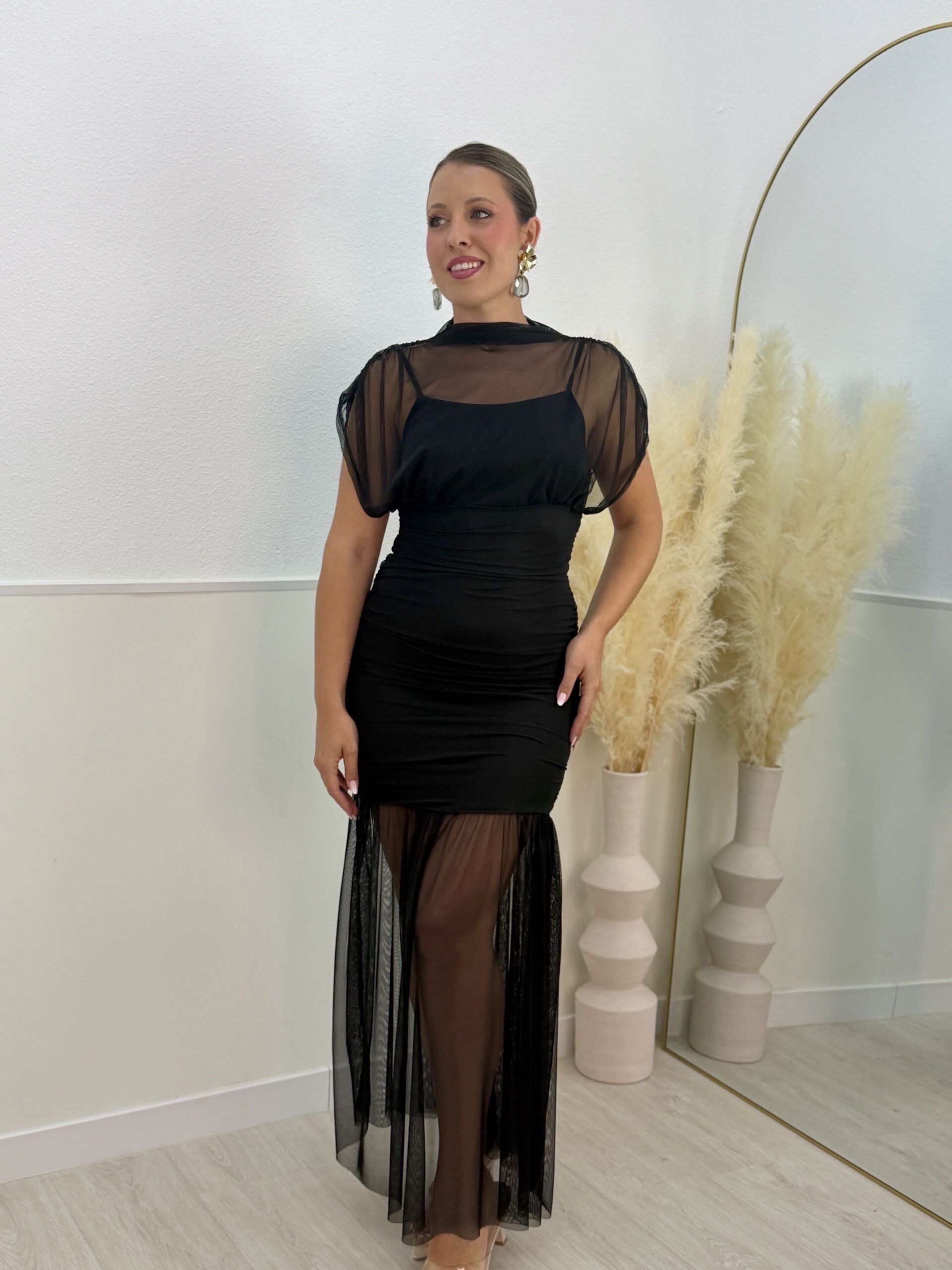 Vestido midi en tono negro con diseño sofisticado y muy especial, confeccionado en tejido elástico combinado con tul transparente que aporta un toque elegante y sensual. La parte superior destaca por su efecto semitransparente con mangas abullonadas en tul, creando volumen y un aire delicado.